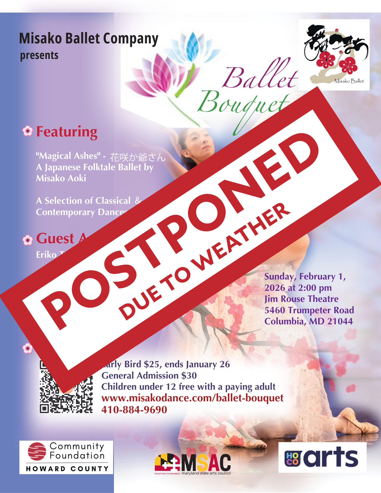 Because all community-sponsored programs in Howard County Public School buildings are canceled this weekend, (including the Jim Rouse Theatre), Misako Ballet Company must cancel its performance of Ballet Bouquet, scheduled for February 1 at 2:00 pm.